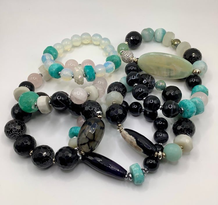 Midnight Frost" collection, where the serene beauty of white and light blue meets the bold elegance of black in a captivating blend of contrasts. Picture bracelets adorned with glistening white pearls, icy blue aquamarine stones, and sleek black onyx beads, each reflecting the ethereal beauty and quiet intensity of a winter's eve. Whether worn alone as a statement piece or layered for a more sophisticated look, our Midnight Frost collection offers a range of options to suit any style or occasion.