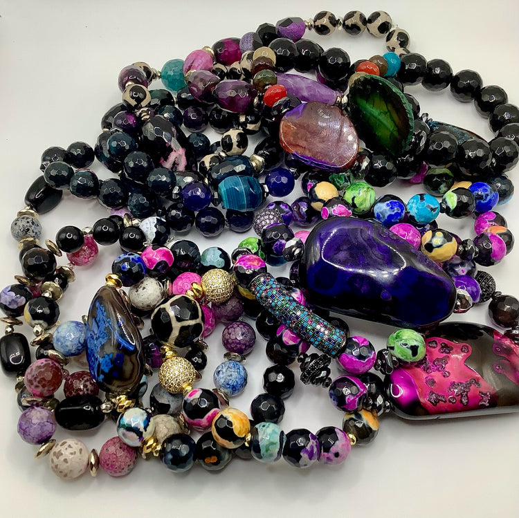 These bracelets are adorned with iridescent beads and shimmering gemstones in hues of deep blues, vibrant purples, fiery oranges, and celestial greens, evoking the awe-inspiring beauty and boundless energy of the cosmos. Whether worn as a symbol of cosmic connection or as a statement of celestial elegance, our Nebula Burst collection offers a celestial journey through the depths of space.